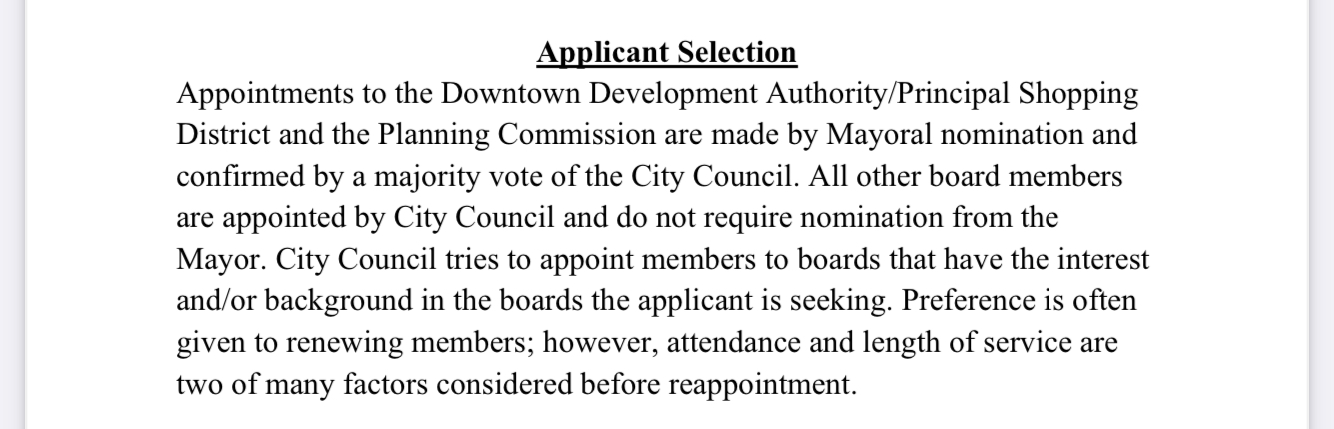 • Mayor-nominates / Council-confirms boards: Planning Commission, DDA, Parks & Rec Board.